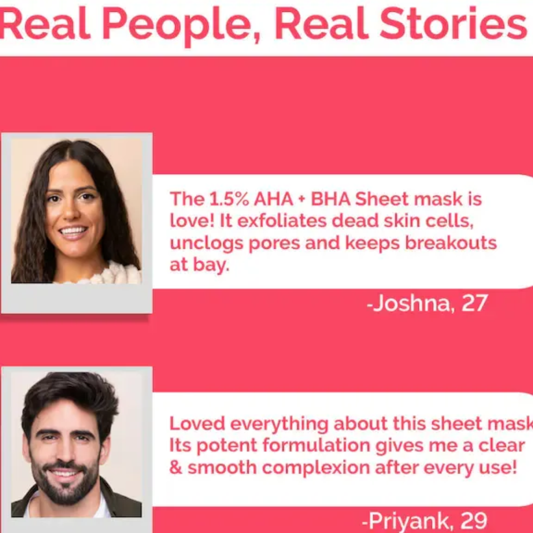 Exfoliating Sheet Mask With 1.5% AHA + BHA: Aha! Your favorite ingredient is now in a sheet mask! Infuse new life into your skin with 1.5% AHA + BHA Sheet Mask. Formulated with Glycolic Acid and Willow Bark Extract, this sheet mask facilitates the skin’s natural exfoliation and targets acne breakouts and blackheads for improved texture and complexion.