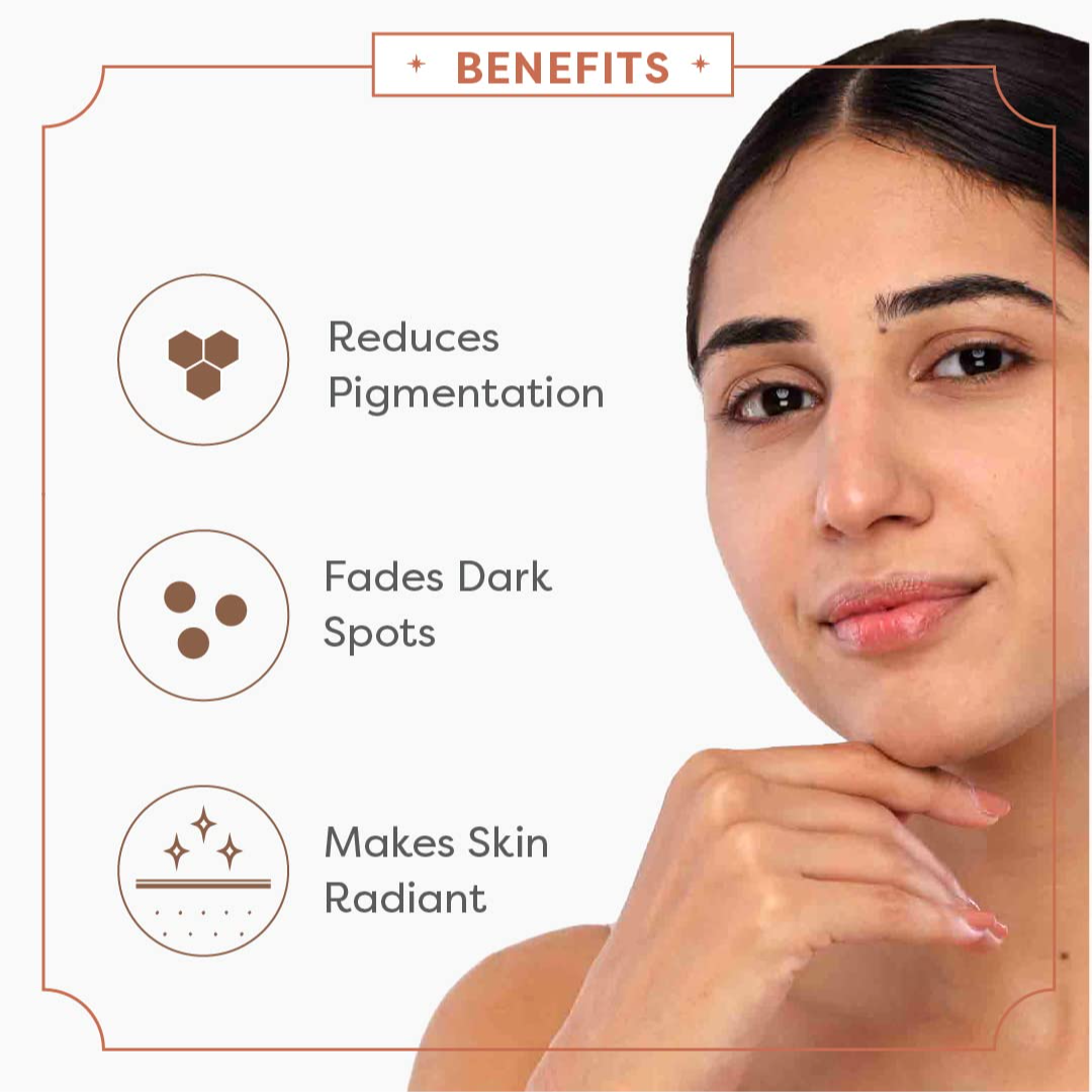 Fades dark spots crafted with a unique blend of natural oils and herbs like saffron and lotus extracts, the 10% kumkumadi skin radiance face serum is highly efficacious in fading dark spots, resulting in skin thats bright and spotless.