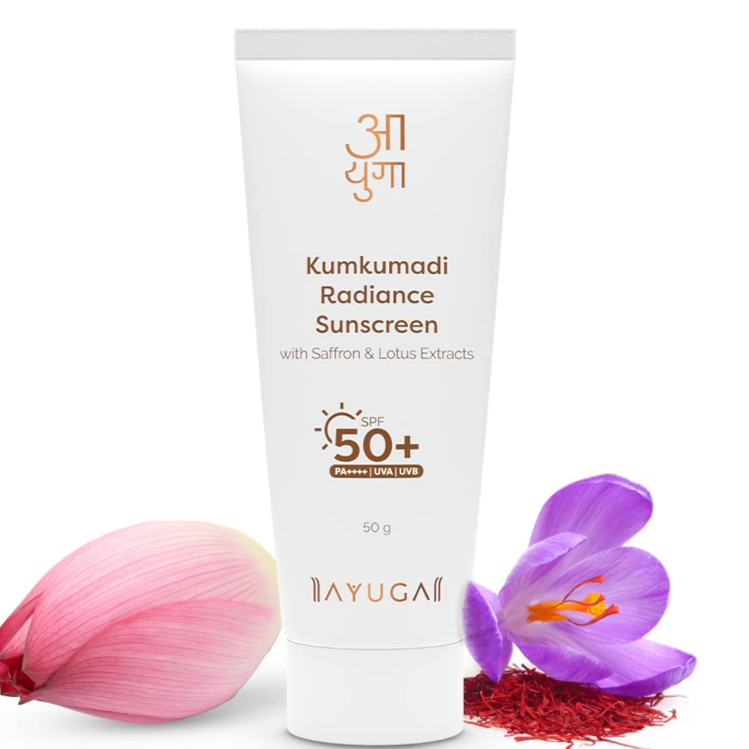 Ayuga Kumkumadi Radiance Sunscreen SPF 50 with Saffron & Lotus Extracts | PA++++ | UVA | UVB | Fights Tan | 50 g
