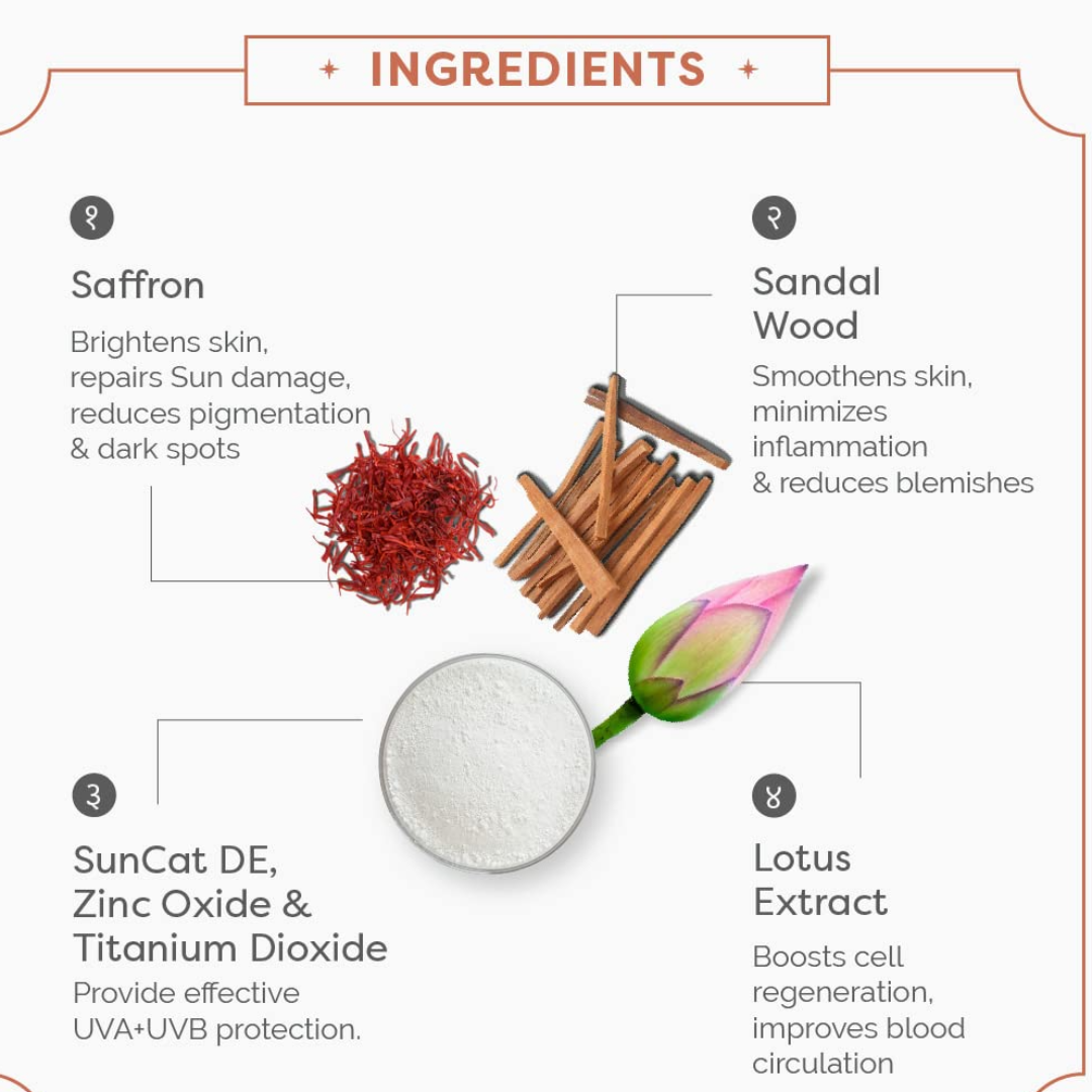 Prevents Sun Tanning & Makes Skin Radiant This sunscreen contains Saffron, with antioxidant properties, that prevents sun damage and controls melanin production in the skin resulting in radiant skin.