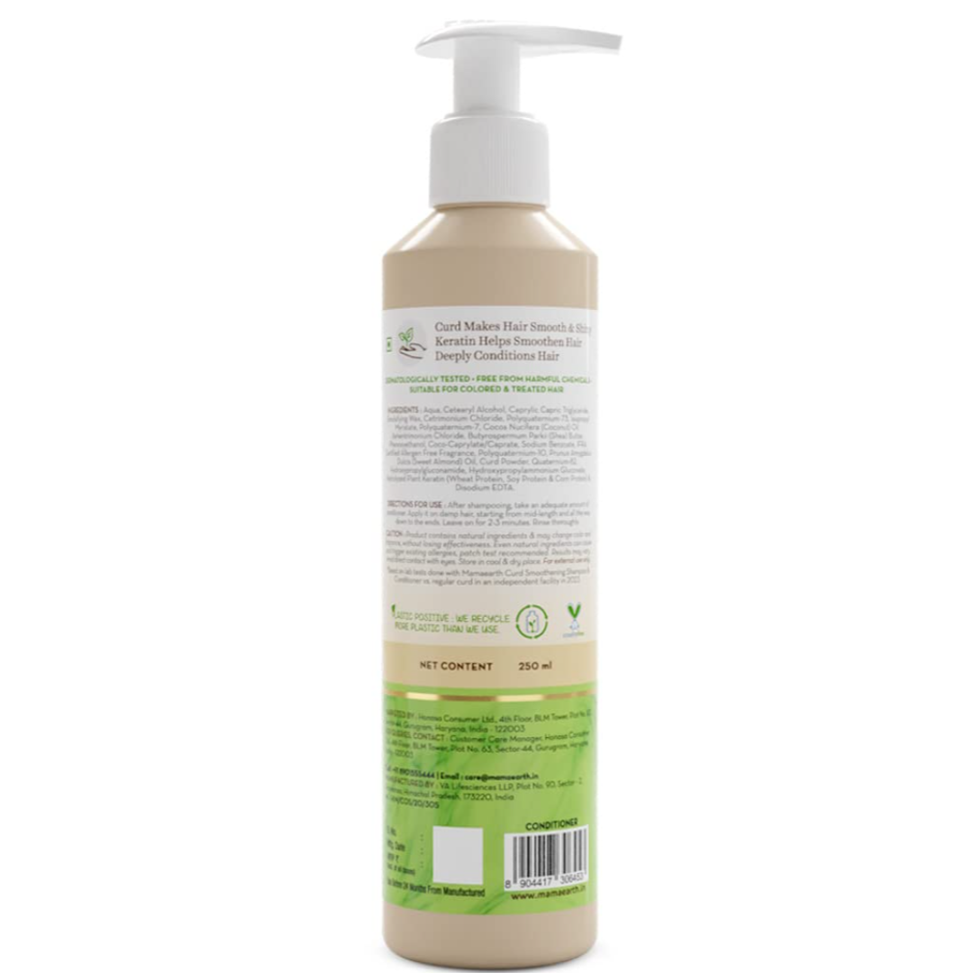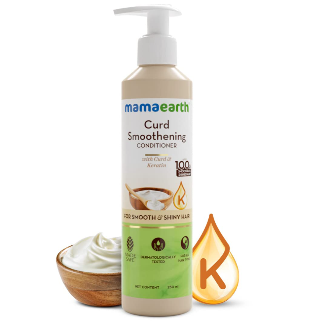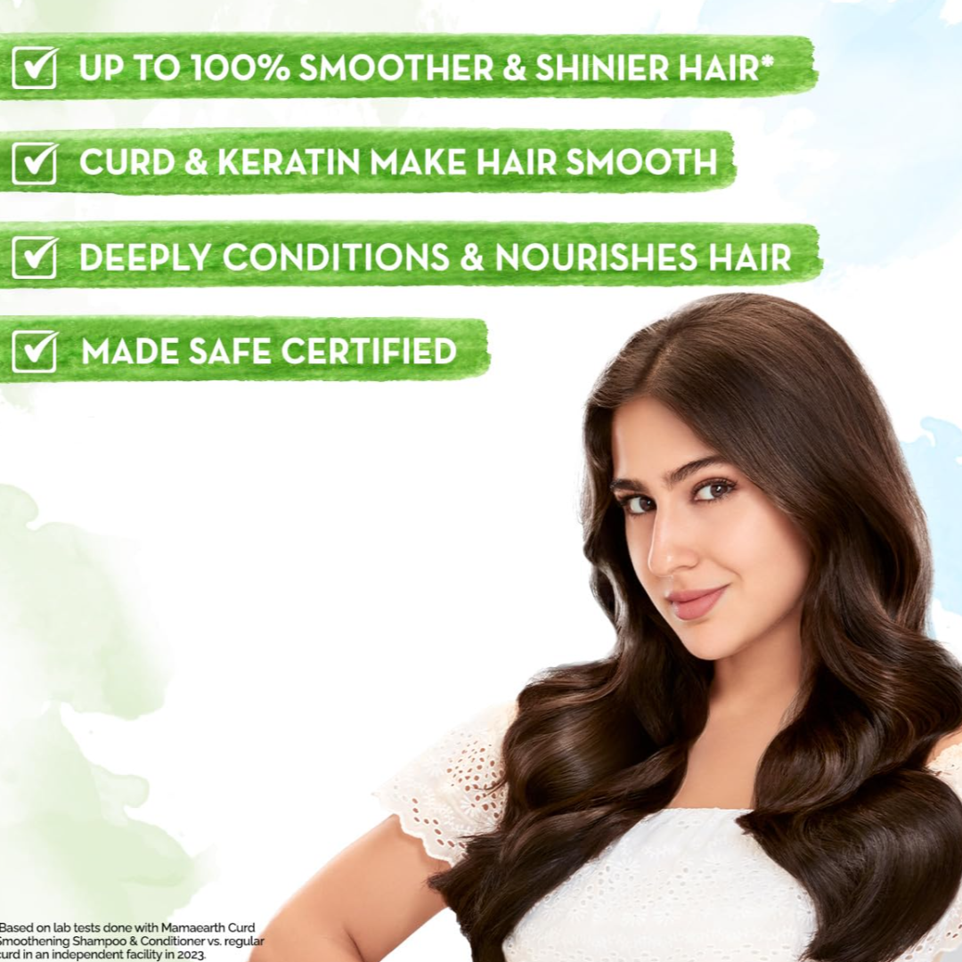UP TO 100% SMOOTHER AND SHINIER HAIR*: Enriched with Curd & Keratin, the Curd Smoothening Conditioner rejuvenates dull & dry hair making them appear up to 100% smoother & shinier*. *Based on lab tests done with Mamaearth Curd Smoothening Shampoo & Conditioner vs. regular curd in an independent facility in 2023.