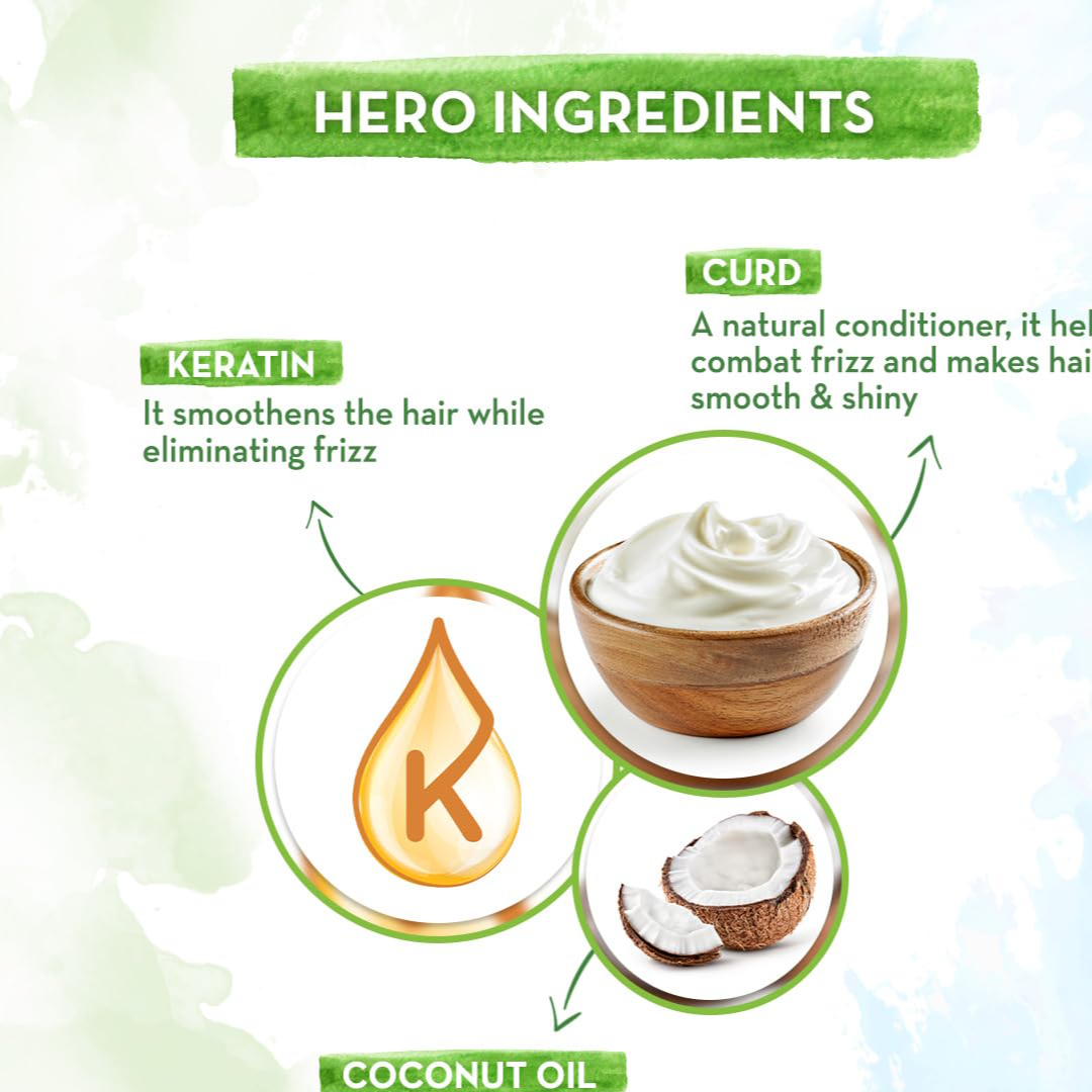 CURD & KERATIN SMOOTHENS HAIR & TAMES FRIZZ: Enriched with Curd & Keratin, the Curd Smoothening Shampoo tames frizz, smoothens the hair & leaves it softer and shinier.