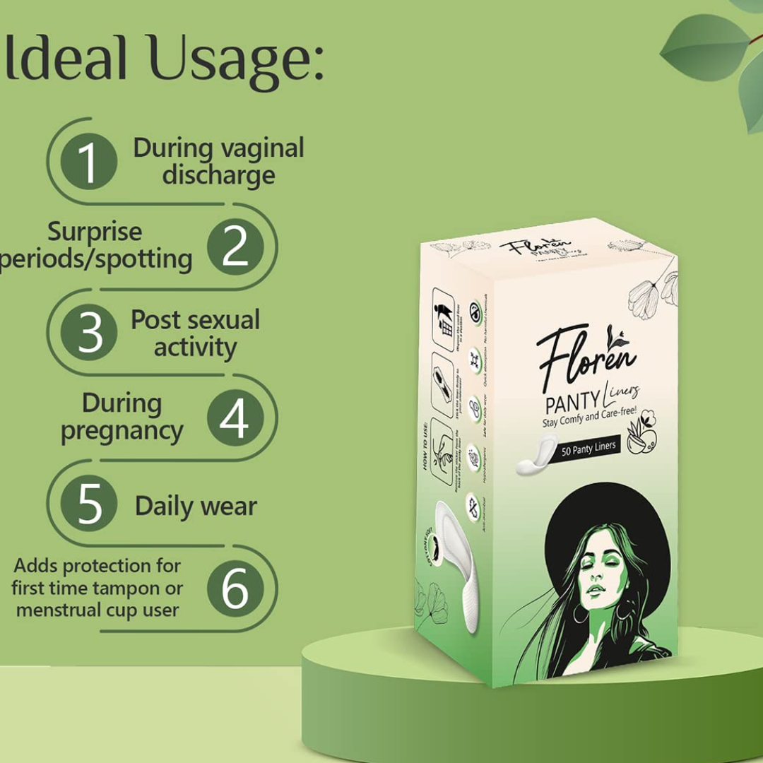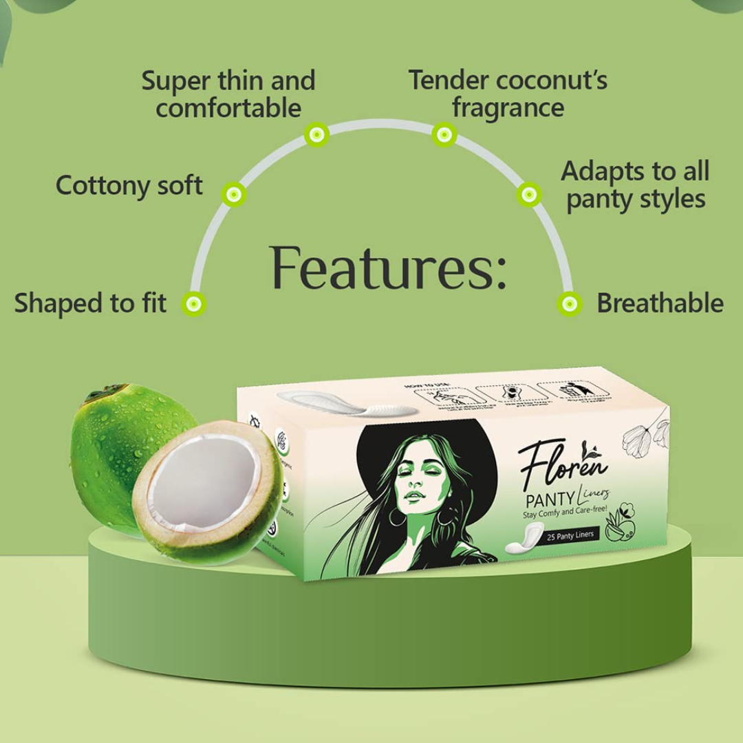 SUPER-SOFT: FLOREN Panty Liners for women are made of the hypoallergenic & organic cotton. They are free from artificial fragrances to give you that soft, comfy feeling without irritating your skin.