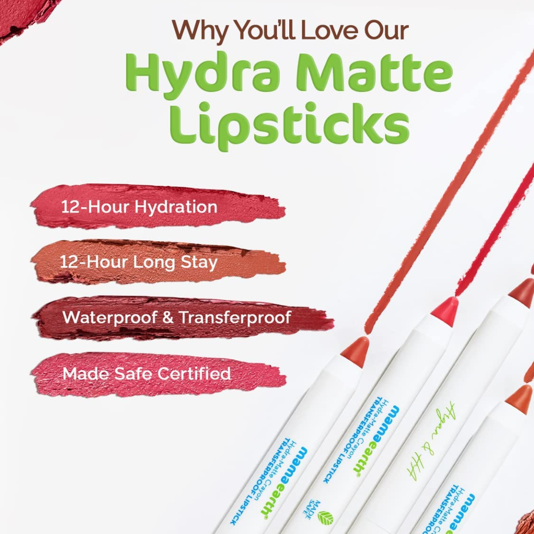 MADE SAFE CERTIFIED: No toxins, just oodles of color and care for your lips. Crafted with natural ingredients, the Hydra-Matte Crayon Transferproof Lipstick are Made Safe Certified and safe for all skin types.<br>