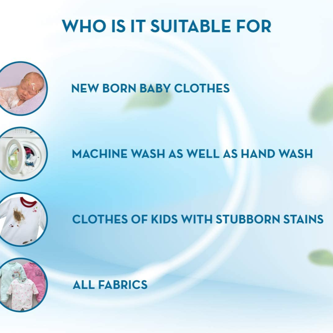 BABY SAFE & BIO DEGRADABLE FORMULA Enriched with the goodness of Bio-enzyme, plant based formula, this is super safe for your baby's skin. Enzymes are cleaning agents that help in breaking down stubborn stains and hence clean the clothes better. Our detergent is biodegradable and soft on hands and clothes.
