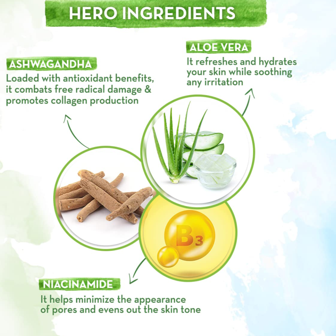 IMPROVES SKIN TEXTURE: Step towards your skincare goals! With the goodness of Ashwagandha, a powerhouse of antioxidants, the day cream combats free radical damage, improving your skin's texture.<br>