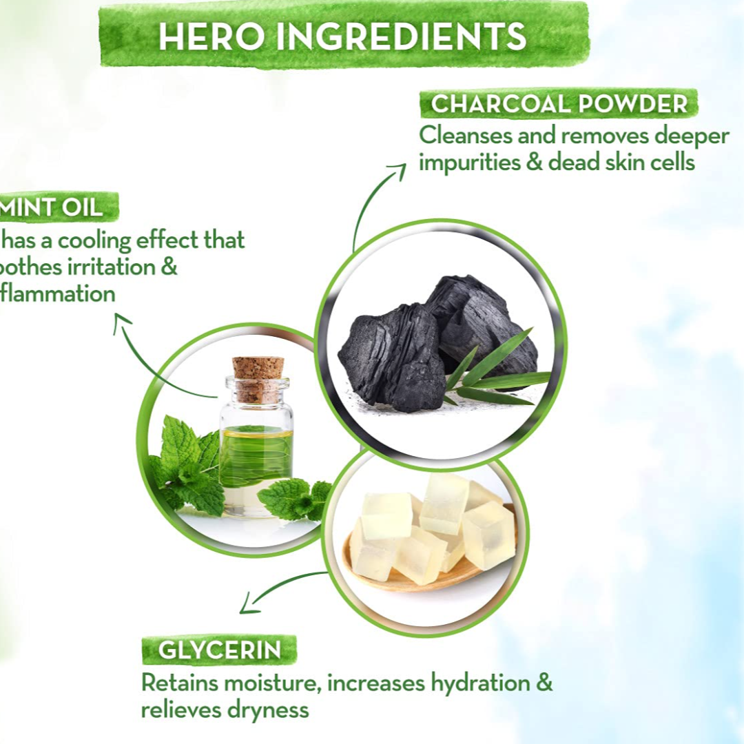 REMOVES SKIN IMPURITIES Dirt and impurities don’t stand a chance. Charcoal in the soap unclogs pores and draws out the impurities. Mint has antiseptic and cooling properties that leave the skin refreshed.