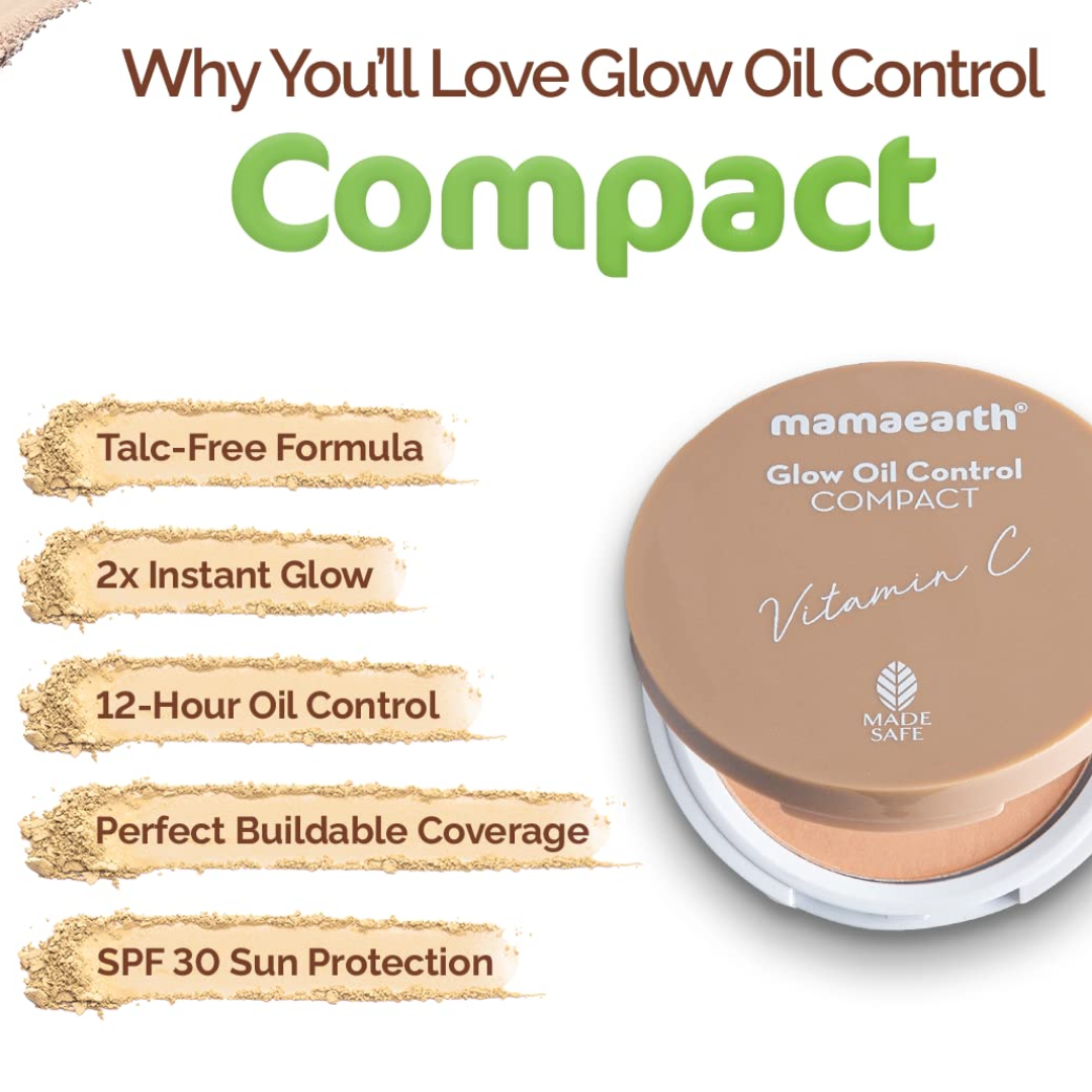 TALC-FREE FORMULA: Glow Oil Control Compact is India's 1st Talc-free and Made Safe certified compact that is safer and gentler on your skin. Truly unique, the formulation mattifies your skin and brightens itm, naturally and is crafted with the finest of ingredients.