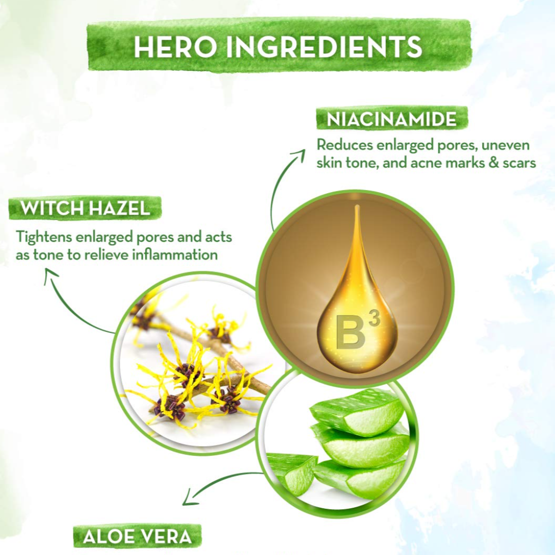 REDUCES ACNE MARKS & SCARS: Niacinamide to the rescue! An active form of Vitamin B3, Niacinamide works with Witch Hazel to soothe irritation & control excess oil production to prevent new acne and heal existing scars & blemishes.