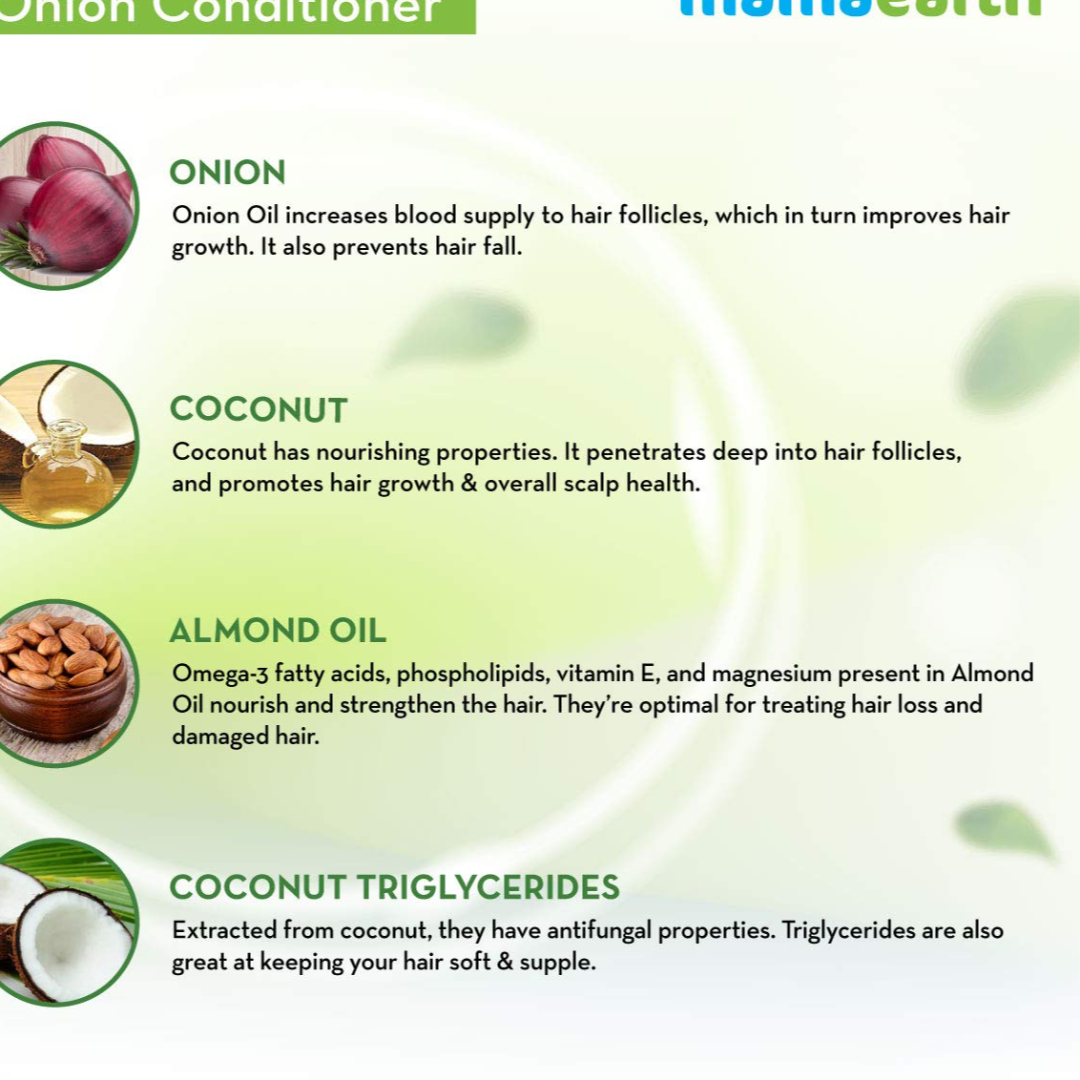 REDUCES HAIRFALL: Onion stimulates the scalp, promoting blood circulation and hair growth. Coconut strengthens hair from root to tip.