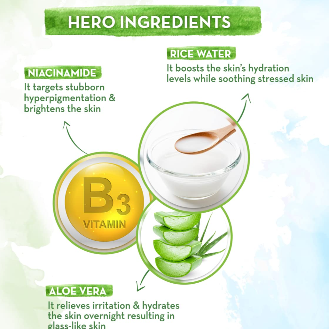 GIVES GLASS SKIN: Wake up to glass skin with Rice Sleeping Face Mask that restores your skin’s glow overnight. All thanks to ingredients like Rice Water, Niacinamide, & Aloe Vera.