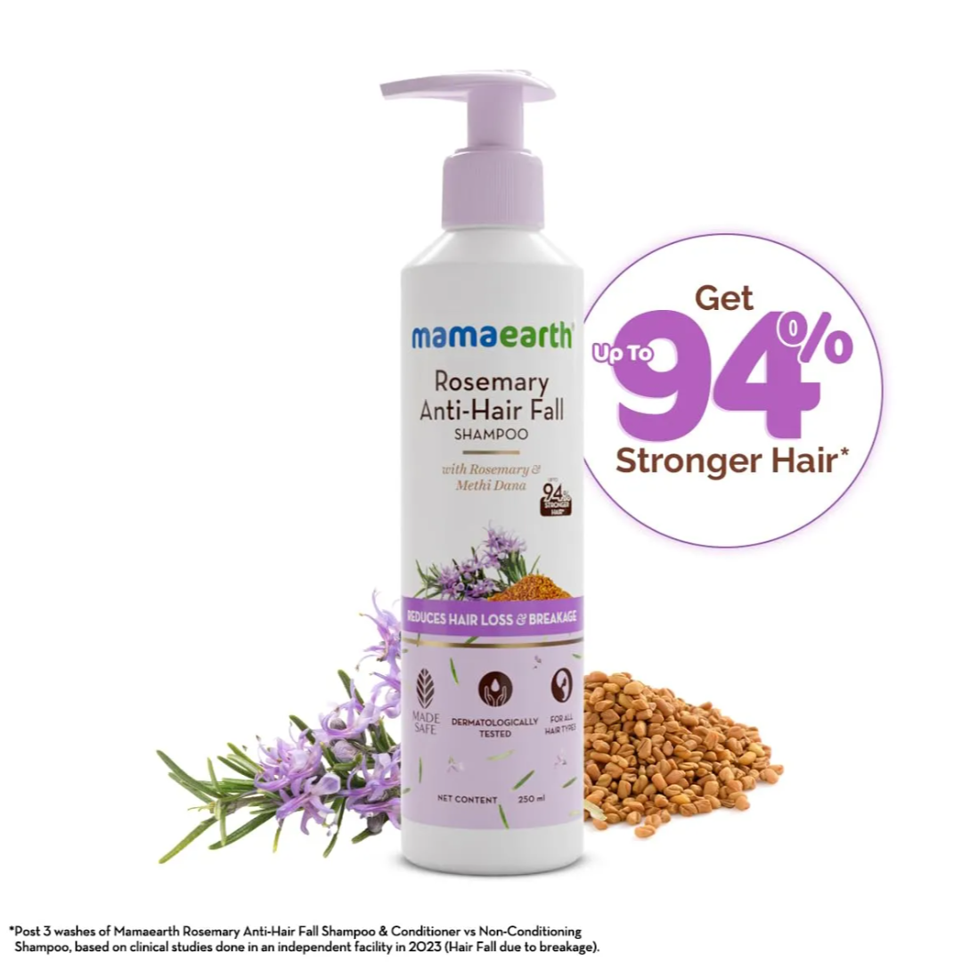 Struggling with excessive hair loss? Mamaearth Rosemary Anti-Hair Fall Shampoo to the rescue! Crafted with the natural goodness of Rosemary, a super potent herb that’s proven to stimulate hair growth. The shampoo is also infused with Methi Dana - a time-tested ingredient that helps control hair fall.