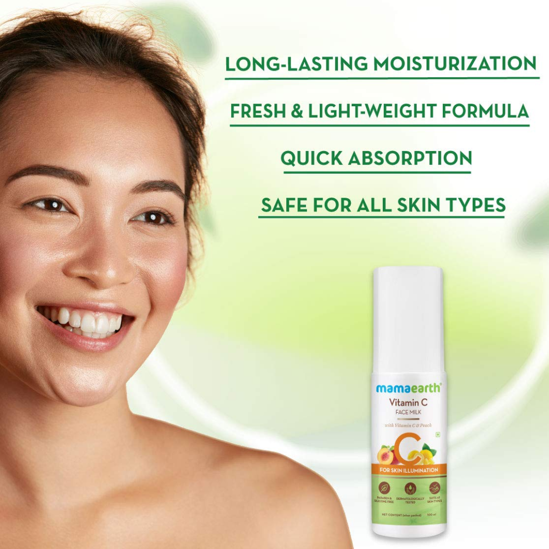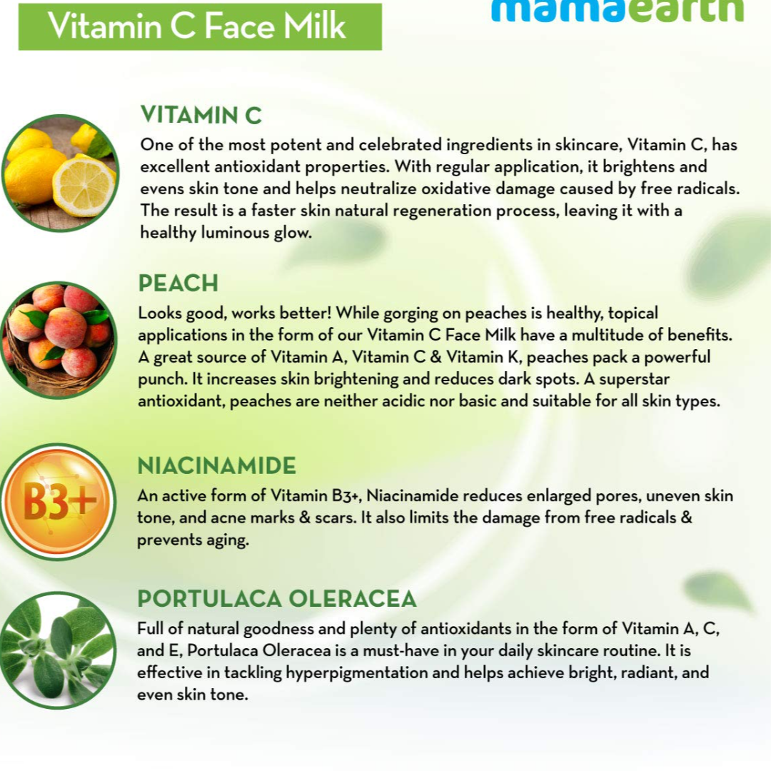 Mamaearth Vitamin C Face Milk is a concoction of nature’s most effective ingredients, like Vitamin C and Peach. The Face Milk dissolves into the skin, giving you a moisture boost. One of the most celebrated ingredients in skincare, Vitamin C is rich in antioxidants and fights free radical damage. Vitamin C, along with Peach and Portulaca Oleracea helps fade pigmentation, reduce dullness, promote collagen production, and prevent the appearance of wrinkles and fine lines. Niacinamide, an active form of Vitamin B3+, further reduces enlarged pores, uneven skin tone, and prevents aging.