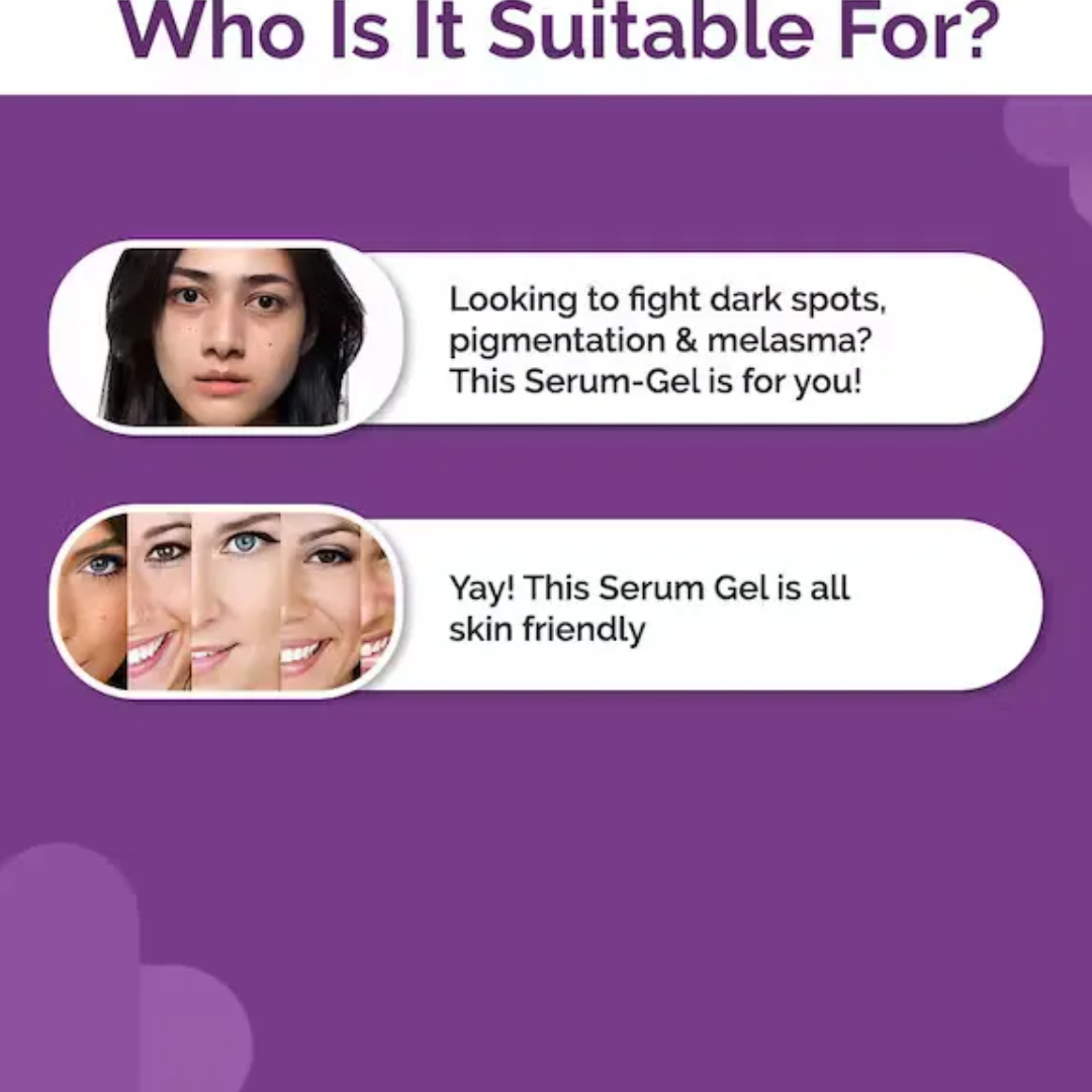 WHO IS IT SUITABLE FOR? Looking to fight pigmentation, dark spots & even skin tone? This Serum - Gel is for you! This Serum-Gel is just the best for anyone with sensitive, dry, and oily skin.
