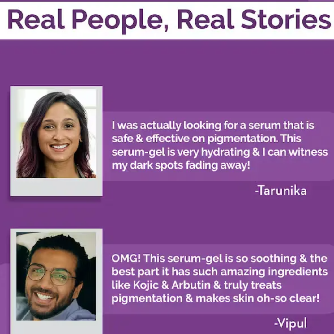 SAFE & EFFECTIVE FORMULATION: Free from mineral oil, dye, parabens, and sulfates, this Serum-Gel is to fight pigmentation, dark spots & even skin tone. It has a safe & effective formulation that offers a visible difference after every use.