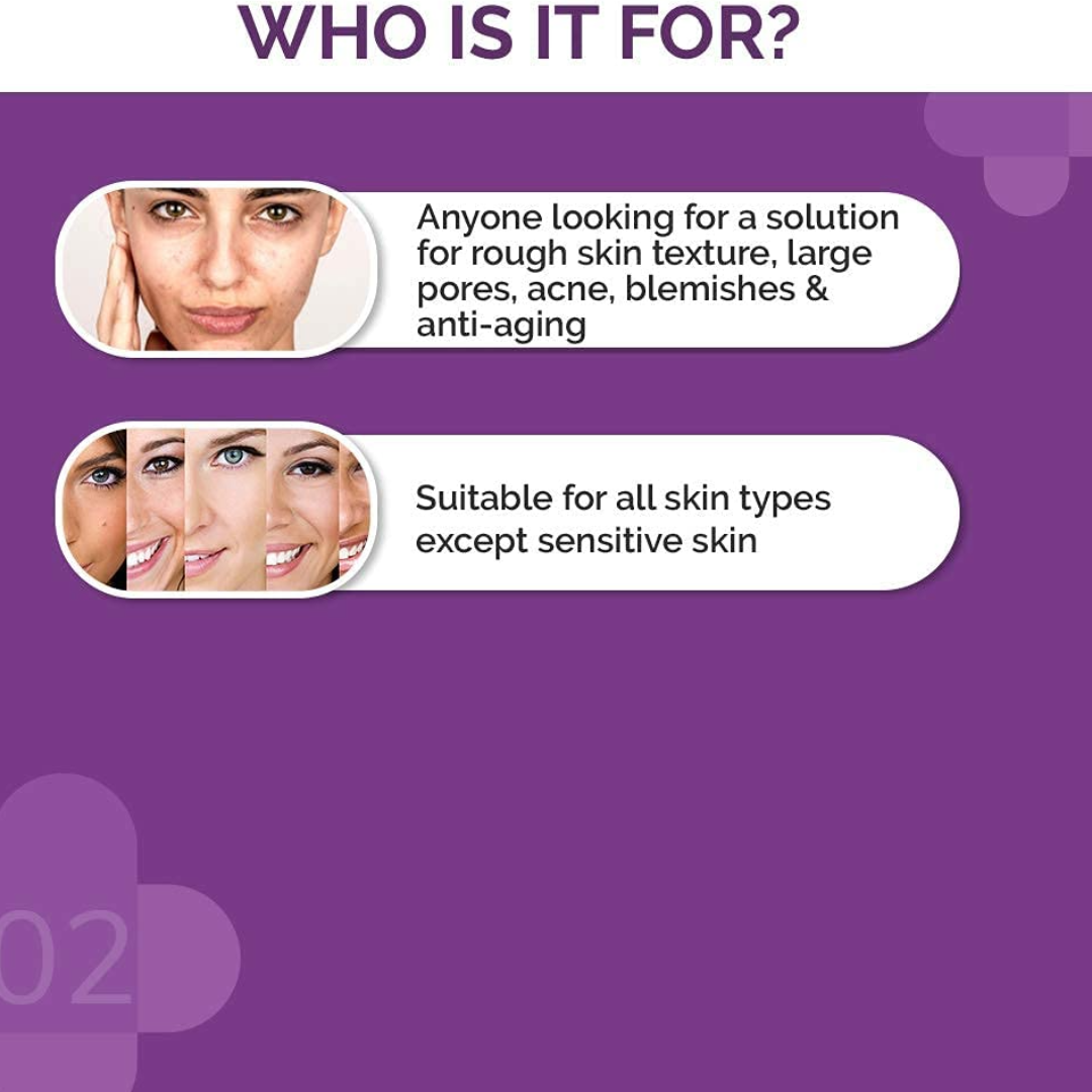 WHO IS IT SUITABLE FOR: Suitable for all skin types, except sensitive skin, this peeling solution is for anyone looking for a solution for rough skin texture, large pores, acne, blemishes & anti-aging.