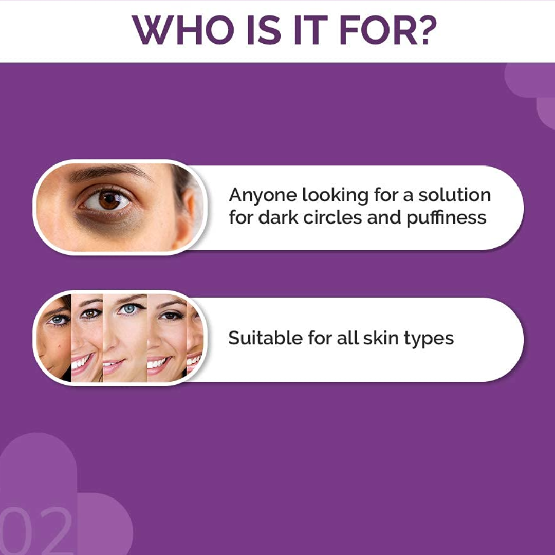 SAFE & EFFECTIVE FORMULATION: Free from mineral oil, dye, paraben, and sulfate, this under eye serum for dark circles & puffiness has a safe & effective formulation that offers visible difference in 3-6 weeks.; WHO IS IT SUITABLE FOR: Suitable for all skin types, this under eye serum is for anyone looking for a solution for dark circles and puffiness.