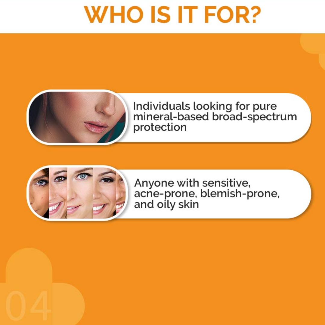 WHO IS IT SUITABLE FOR: The sunscreen is for anyone with sensitive, acne-prone, blemish-prone, and oily skin and individuals looking for pure mineral-based broad-spectrum protection.