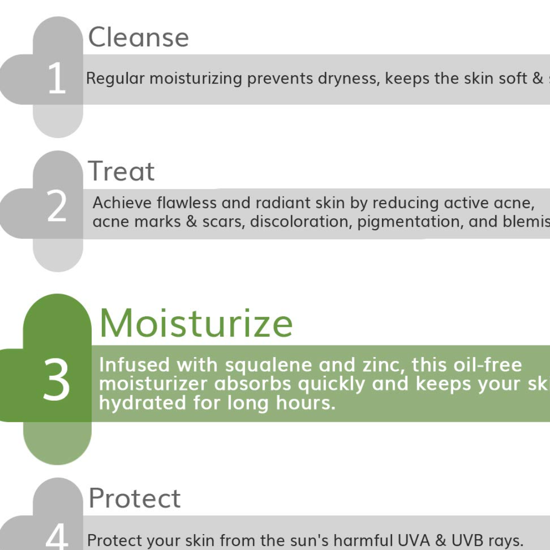 FIGHTS DRYNESS Infused with squalene and zinc, this moisturizer absorbs quickly and keeps your skin hydrated for long hours. It strengthens your skin's natural moisture barrier while soothing and smoothening it.