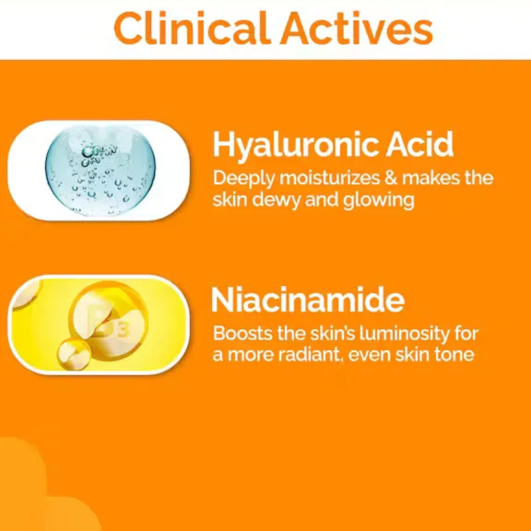 Glows & Evens Skin Tone The dream team of Hyaluronic Acid & Niacinamide keeps the skin dewy & glowing, maintains a healthy skin barrier & evens skin tone.