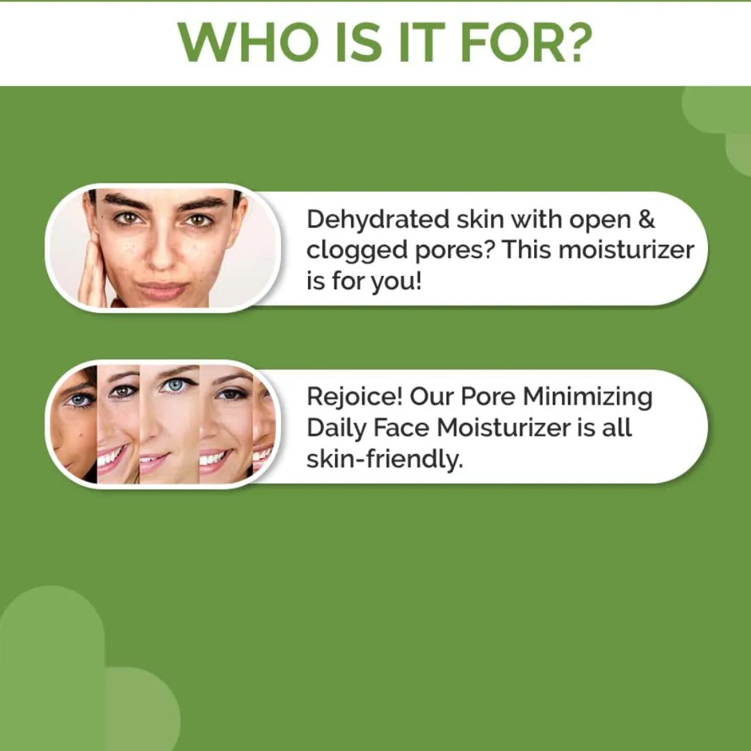 .Nourishes Skin:Say bye to dry. Keep your skin moisturized and nourished at all times with the Pore Minimizing Daily Face MoisturizerReduces Excess Sebum:Powered with Niacinamide, the Pore Minimizing Daily Face Moisturizer controls excess sebum production for oil-free skin.